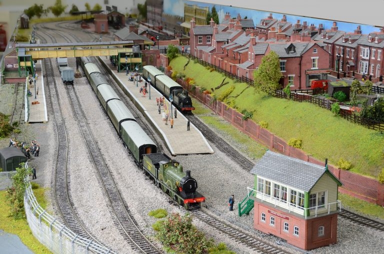 Hazelbury Junction depicts a busy main line station with platforms situated on loops so as to allow express trains to pass local trains waiting at the platforms. The station is a terminus of the Branch line to Greystone End station which has its own platform adjacent to the Down platform. There is a goods shed, a two road engine shed with ash pit, coal yard, coaling facilities for the engines and a town with a brewery and allotments.